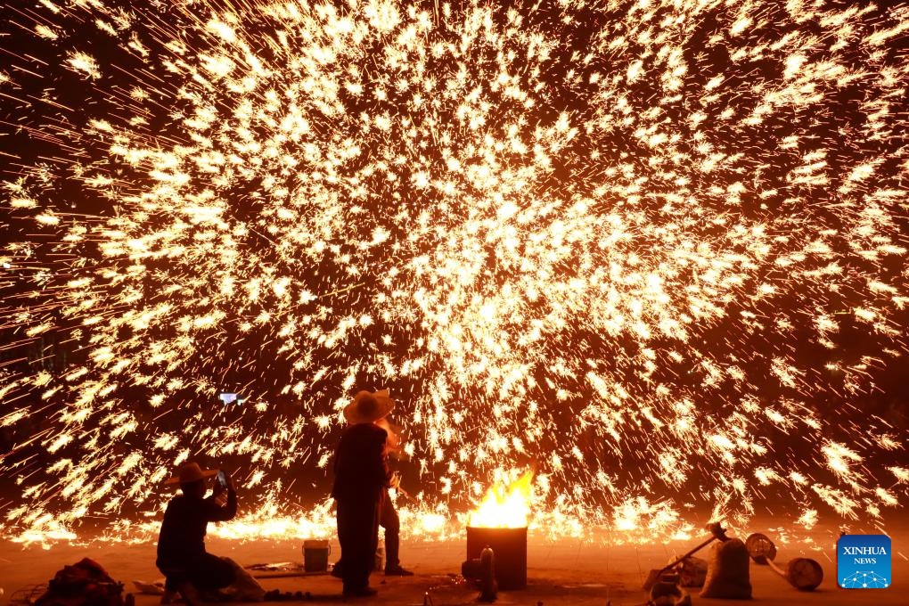 Performers stage a molten iron fireworks show in Anyang, central China's Henan Province, Feb. 14, 2026. China is alive with vibrant celebrations with the Spring Festival just around the corner. (Photo by Liu Xiaokun/Xinhua)