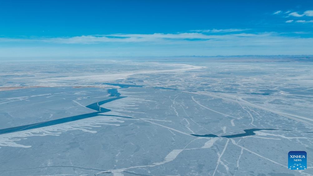 An aerial drone photo taken on Feb. 14, 2026 shows a view of Qinghai Lake in northwest China's Qinghai Province. Qinghai Lake, China's largest inland saltwater lake, now covered in ice, presents a breathtaking scenery. (Xinhua/Du Xiaowei)
