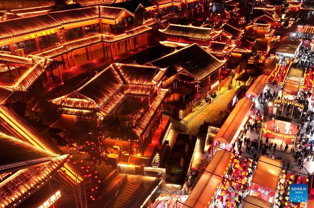 An aerial drone photo taken on Feb. 17, 2026 shows tourists tasting local delicacies on a snack street in Xuan'en County, central China's Hubei Province. During the Spring Festival, lantern decorations across the country created a joyful atmosphere for the holiday. (Photo by Song Wen/Xinhua)