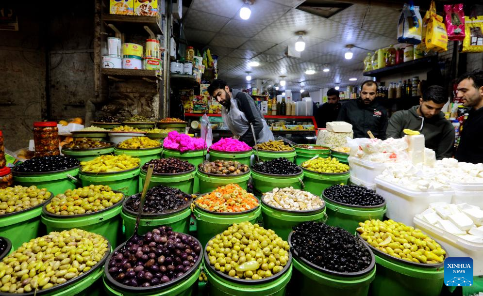 A vendor sells olives at a market during Ramadan in Amman, Jordan, on Feb. 19, 2026. (Photo by Mohammad Abu Ghosh/Xinhua)