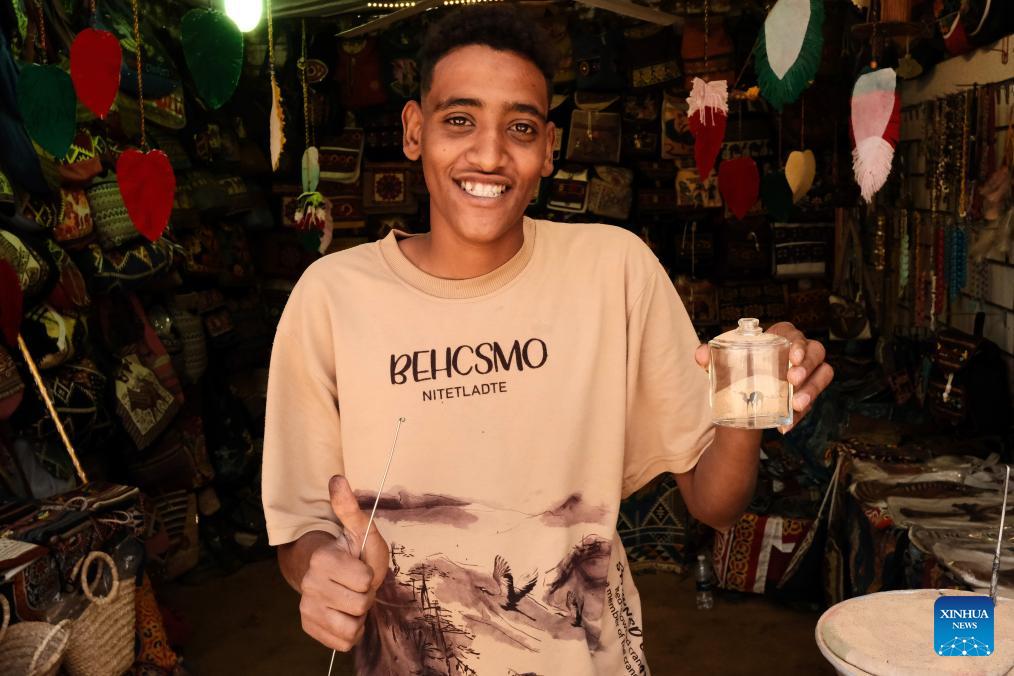A man shows a sand art product at a Nubian village in Aswan, Egypt, Feb. 20, 2026. The Nubians are an ethno-linguistic group living along the Nile River in southern Egypt and northern Sudan, with a distinct language and rich cultural traditions. (Xinhua/Xin Mengchen)