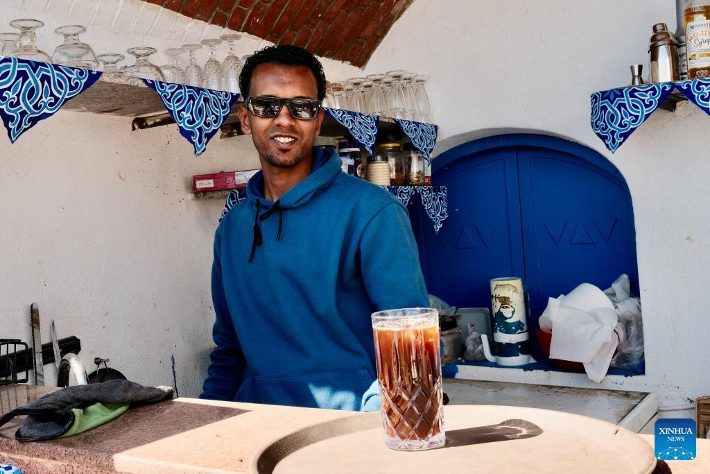 A man serves coffee at a Nubian village in Aswan, Egypt, Feb. 20, 2026. The Nubians are an ethno-linguistic group living along the Nile River in southern Egypt and northern Sudan, with a distinct language and rich cultural traditions. (Xinhua/Xin Mengchen)