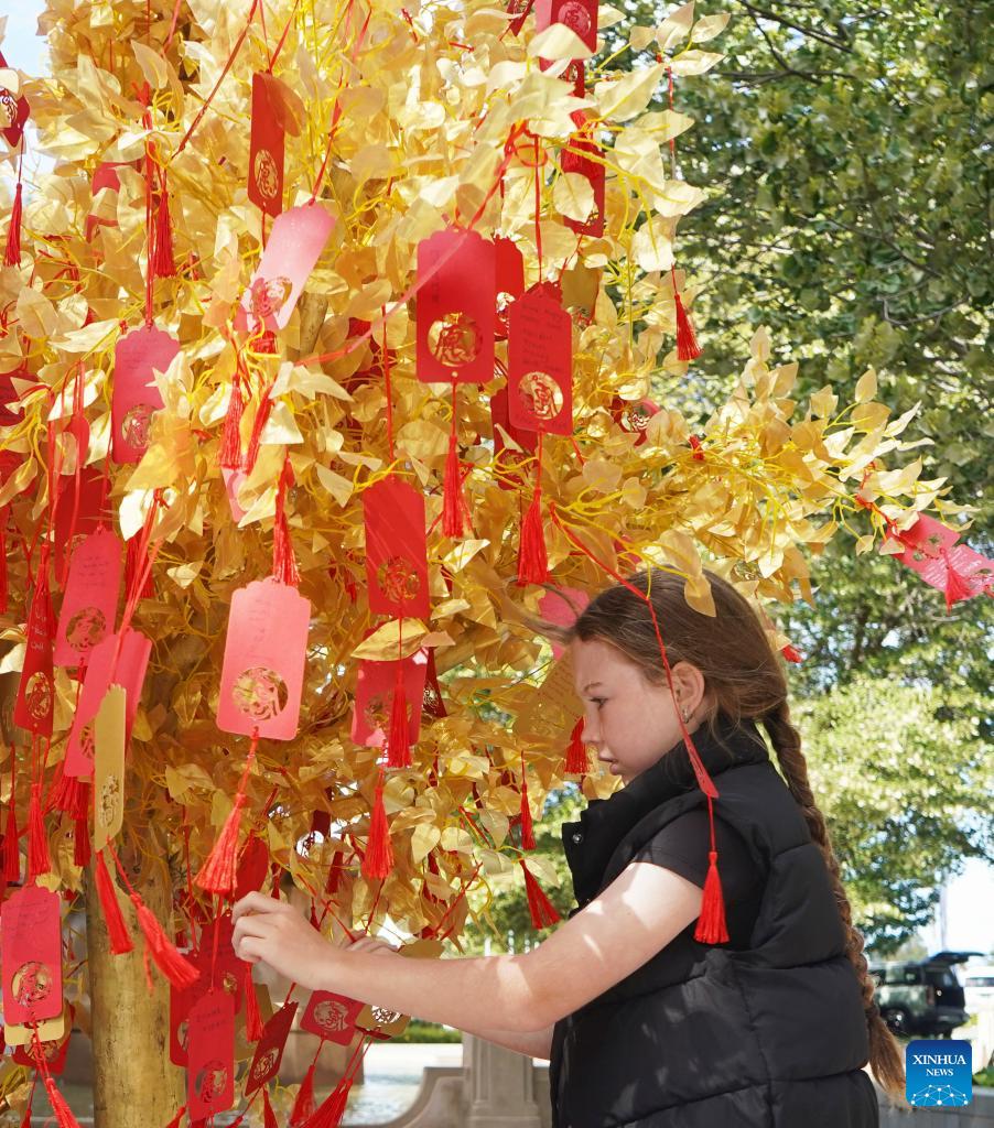 A girl hangs a wish tag at an event celebrating the Spring Festival in Christchurch, New Zealand, Feb. 21, 2026. A series of events celebrating the Spring Festival is held here from Feb. 20 to 22. (Photo by Chen Siyumeng/Xinhua)