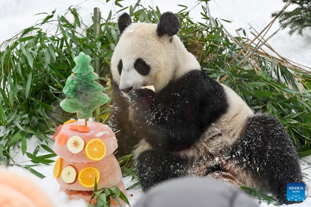 Giant panda Katyusha enjoys the ice cake during an event celebrating the Chinese Lunar New Year at the Moscow Zoo in Moscow, Russia, Feb. 21, 2026.