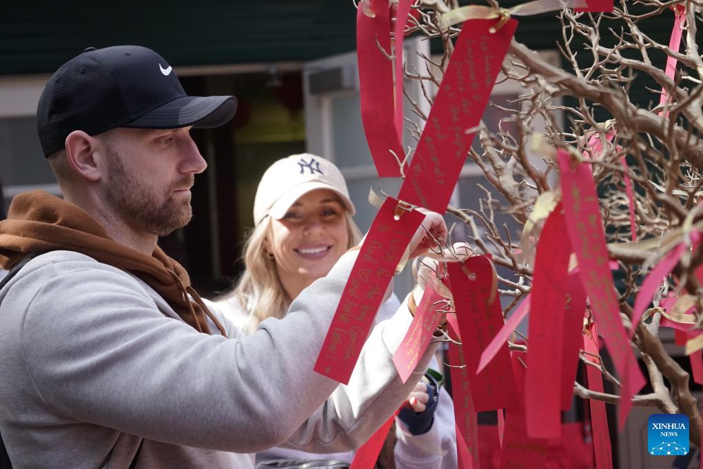 Visitors attach notes of wishes on the wish tree during a Chinese New Year celebration at San Diego Zoo in San Diego, California, the United States, on Feb. 21, 2026. The zoo began a two-day Chinese New Year celebration on Saturday. (Photo by Zeng Hui/Xinhua)