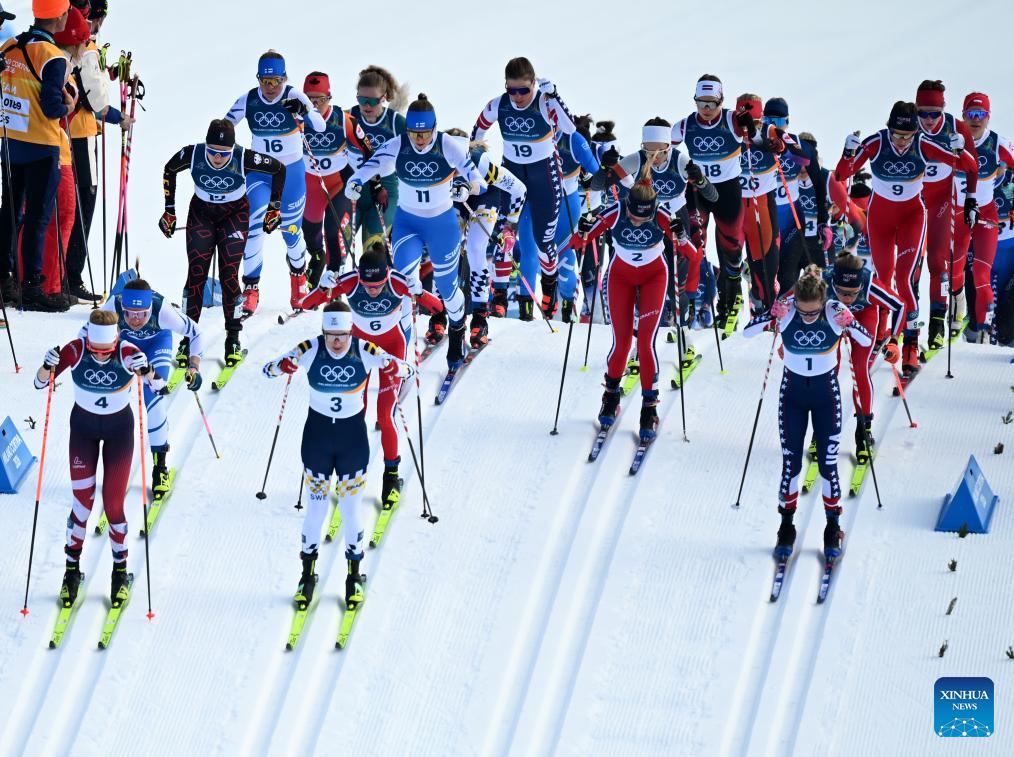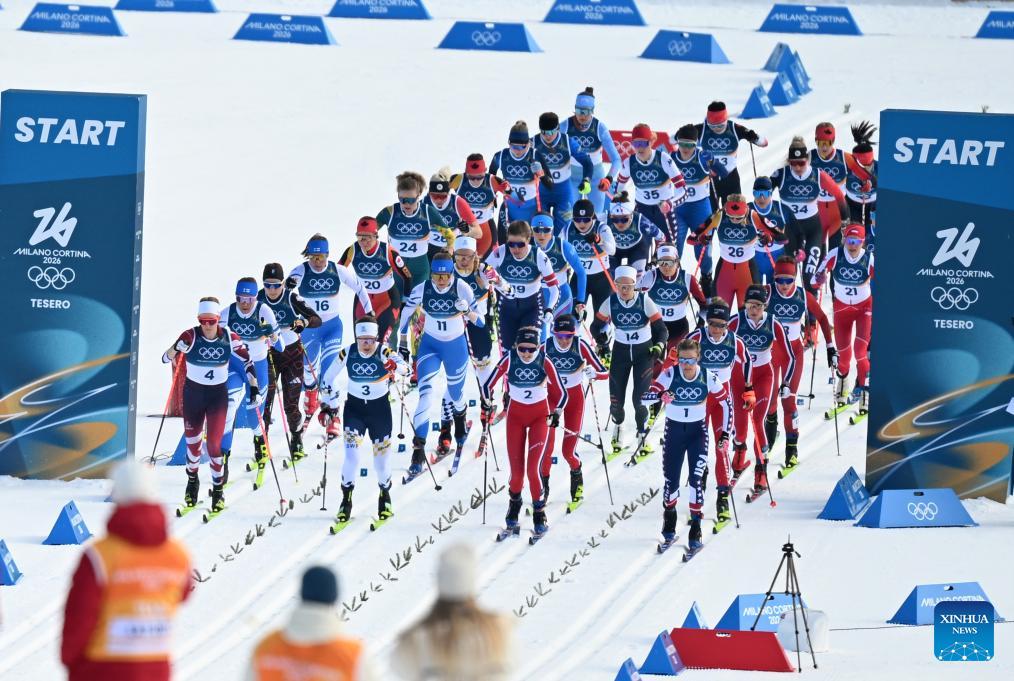 Athletes start during the cross-country skiing women's 50km mass start classic match at the Milan-Cortina 2026 Olympic Winter Games in Tesero, Italy, Feb. 22, 2026. (Xinhua/He Canling)