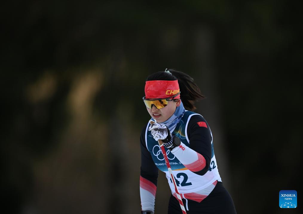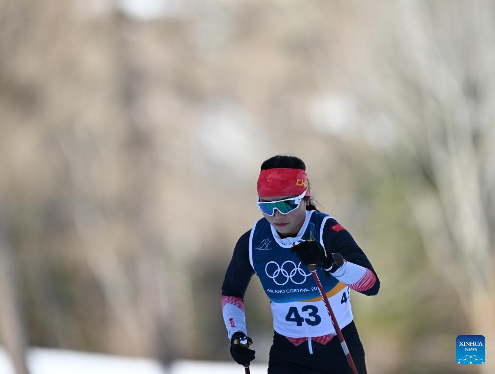 Chi Chunxue of China competes during the cross-country skiing women's 50km mass start classic match at the Milan-Cortina 2026 Olympic Winter Games in Tesero, Italy, Feb. 22, 2026. (Xinhua/He Canling)