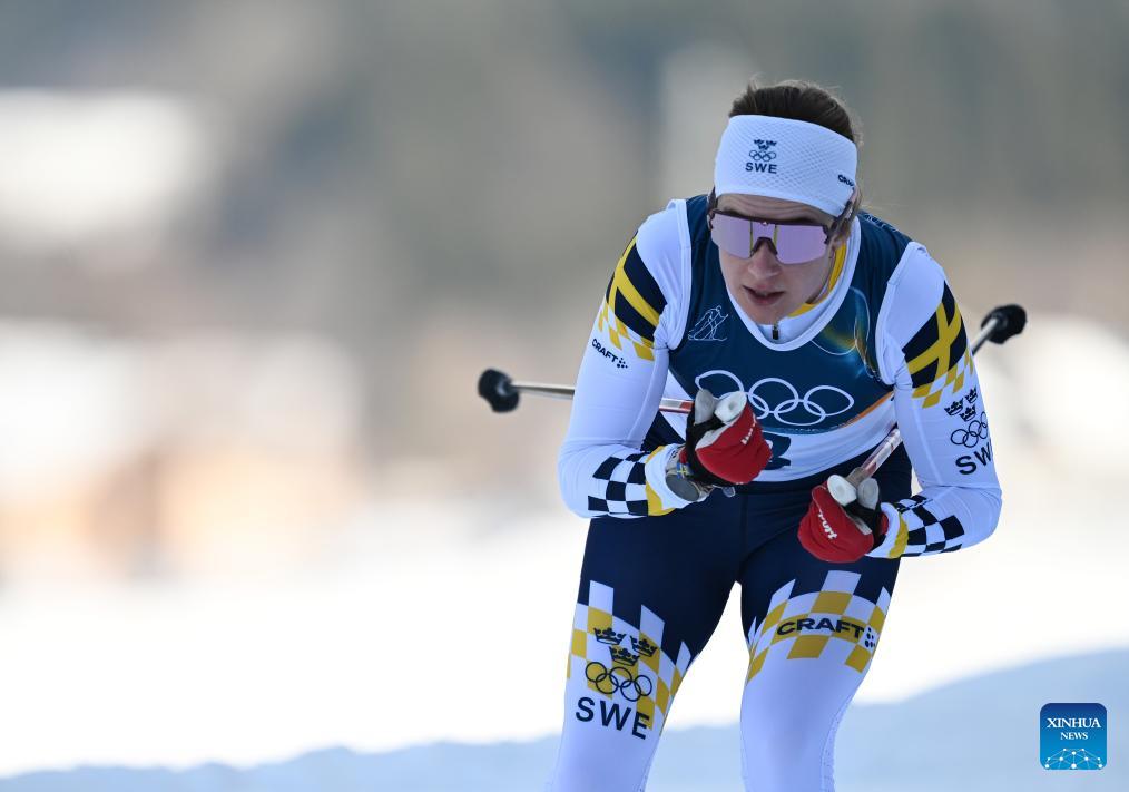 Ebba Andersson of Sweden competes during the cross-country skiing women's 50km mass start classic match at the Milan-Cortina 2026 Olympic Winter Games in Tesero, Italy, Feb. 22, 2026. (Xinhua/He Canling)