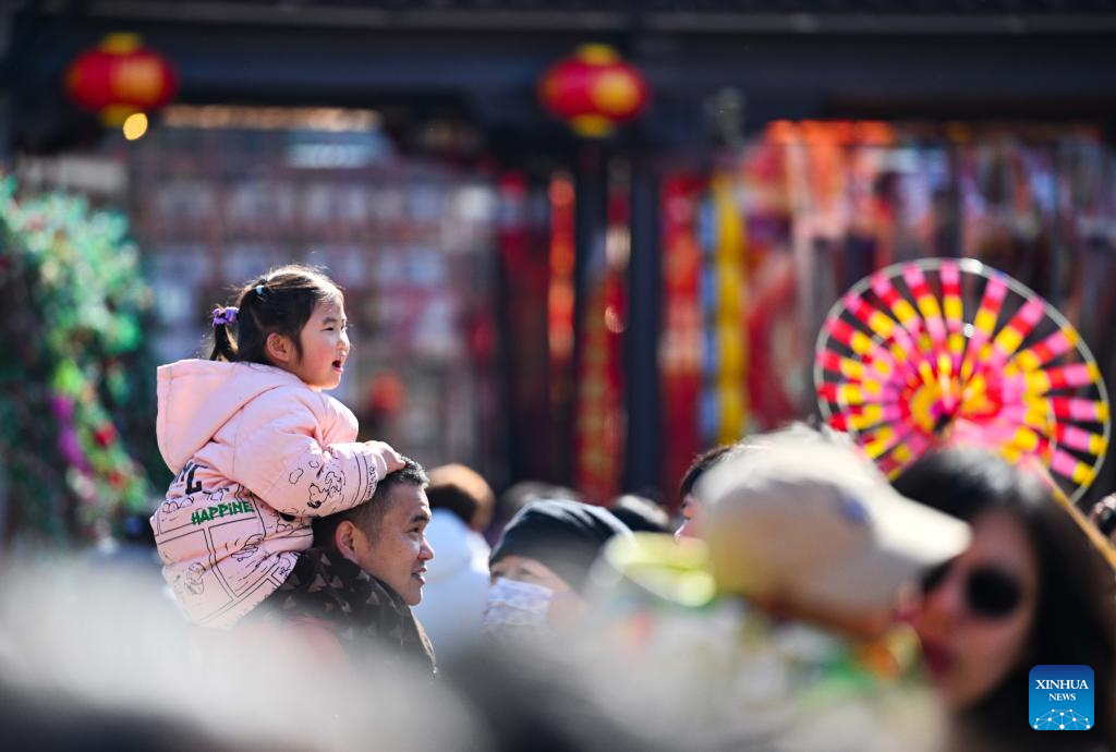 Visitors have fun at Yangliuqing ancient town in Tianjin, north China, Feb. 22, 2026. Yangliuqing ancient town launched a range of activities featuring folk customs, traditional culture and interactive experiences, offering visitors an immersive folk feast during this Spring Festival holiday. (Xinhua/Zhao Zishuo)