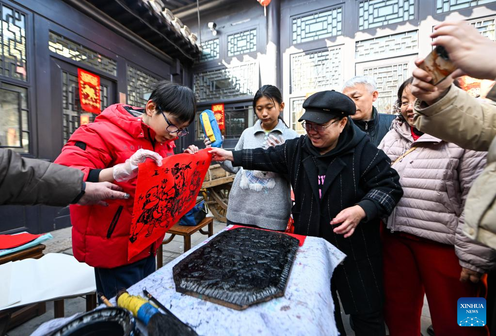 Visitors learn to make woodblock prints at Yangliuqing ancient town in Tianjin, north China, Feb. 22, 2026. Yangliuqing ancient town launched a range of activities featuring folk customs, traditional culture and interactive experiences, offering visitors an immersive folk feast during this Spring Festival holiday. (Xinhua/Zhao Zishuo)