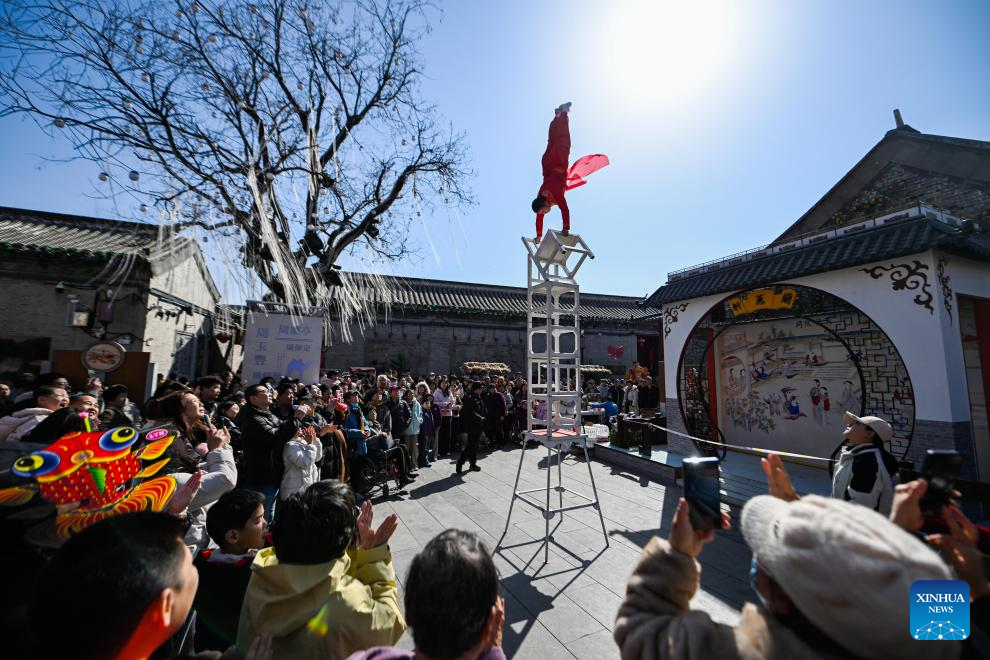 Visitors watch an acrobatic show at Yangliuqing ancient town in Tianjin, north China, Feb. 22, 2026. Yangliuqing ancient town launched a range of activities featuring folk customs, traditional culture and interactive experiences, offering visitors an immersive folk feast during this Spring Festival holiday. (Xinhua/Zhao Zishuo)