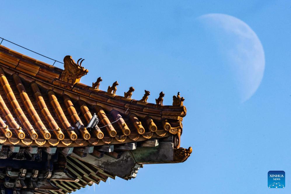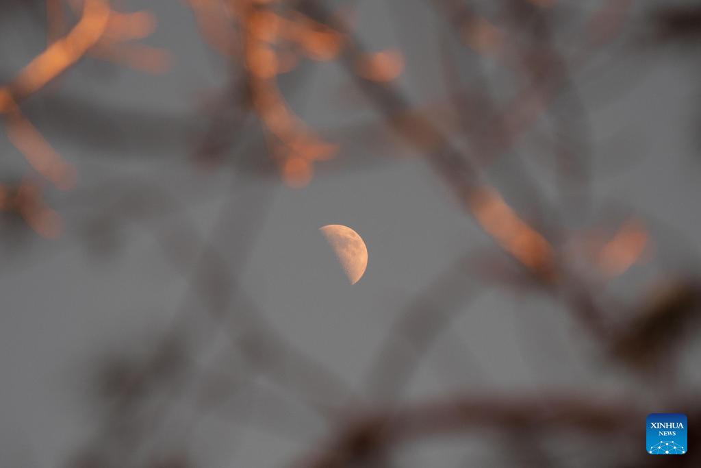 This photo taken on Feb. 24, 2026 shows the moon over Yimei District of Yichun, northeast China's Heilongjiang Province. The largest first quarter moon of the year appeared in the sky on Tuesday. The moon was near its perigee in orbit, approximately 370,000 kilometers from the Earth. (Photo by Li Jiaxing/Xinhua)