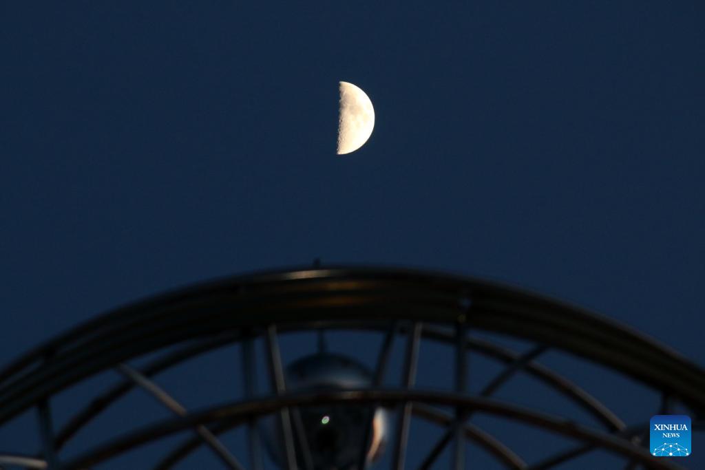 This photo taken on Feb. 24, 2026 shows the moon over Daqing City, northeast China's Heilongjiang Province. The largest first quarter moon of the year appeared in the sky on Tuesday. The moon was near its perigee in orbit, approximately 370,000 kilometers from the Earth. (Photo by Liu Wei/Xinhua)