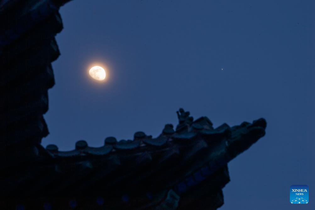 This photo taken on Feb. 27, 2026 shows the planet of Jupiter next to the moon in the sky over Qiqihar City, northeast China's Heilongjiang Province. (Photo by Wang Yonggang/Xinhua)