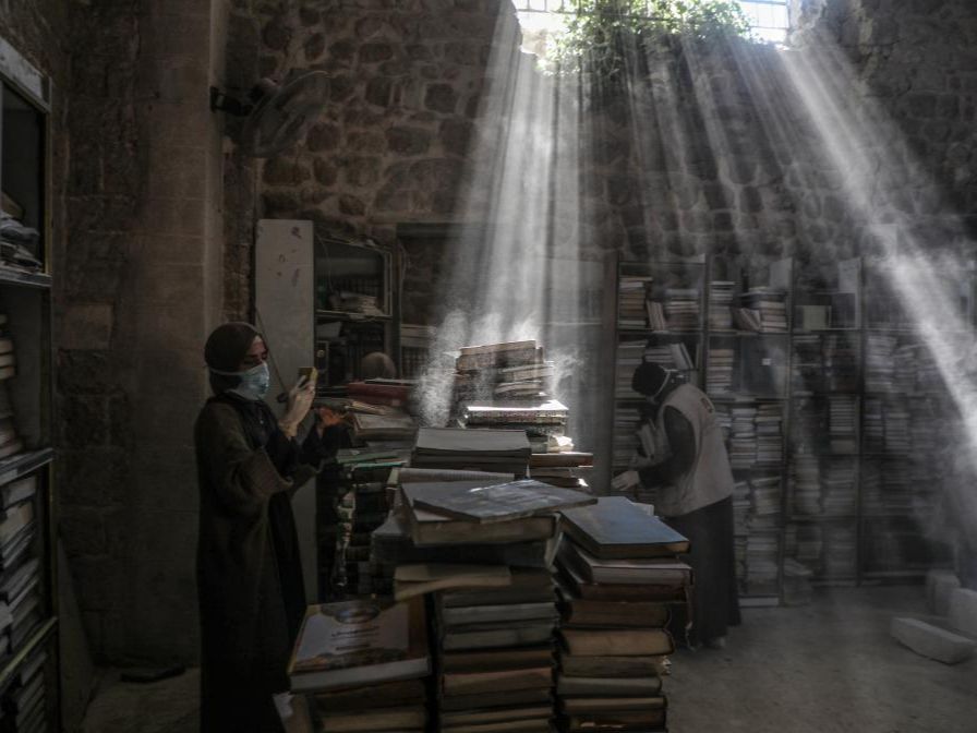 Palestinian volunteers dust books as part of the initial rescue and restoration efforts for books and manuscripts destroyed during the Israeli bombardment of the Gaza Strip, inside the library of the Great Omari Mosque in Gaza City's Old City, on March 2, 2026. (Photo: Xinhua)