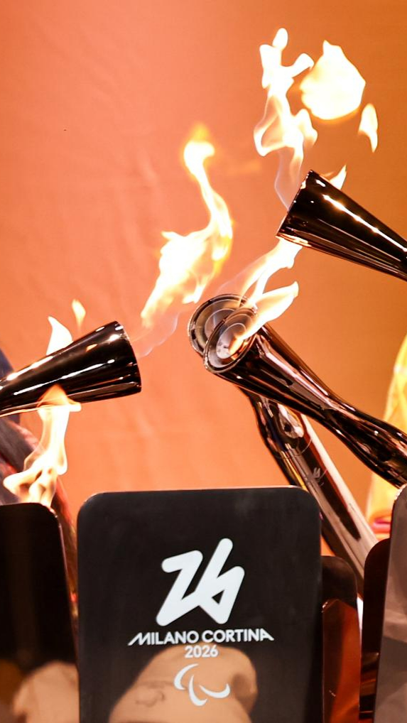 Torchbearers unify the flame during the Milan-Cortina 2026 Paralympic Winter Games Torch Relay and Flame Unifying Ceremony in Cortina D'Ampezzo, Italy, March 3, 2026. (Photo: Xinhua)