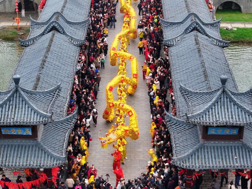 A drone photo taken on March 4, 2026 shows a folk performance in Quanjiao County of Chuzhou City, East China's Anhui Province. (Photo: Xinhua)