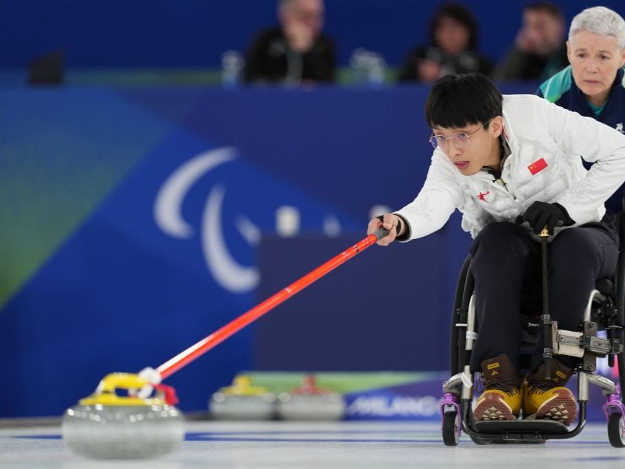 Yang Jinqiao of China competes during the wheelchair curling mixed doubles round robin session 1 match between China and Japan at the Milan-Cortina 2026 Paralympic Winter Games in Cortina D'ampezzo, Italy, March 4, 2026. (Photo: Xinhua)