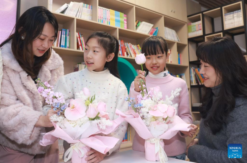 Students learn flower arrangement with their mothers at a primary school in Hongshan District of Wuhan, central China's Hubei Province, March 8, 2026. Various events were held across China on Sunday to mark the International Women's Day. (Photo by Zhao Jun/Xinhua)
