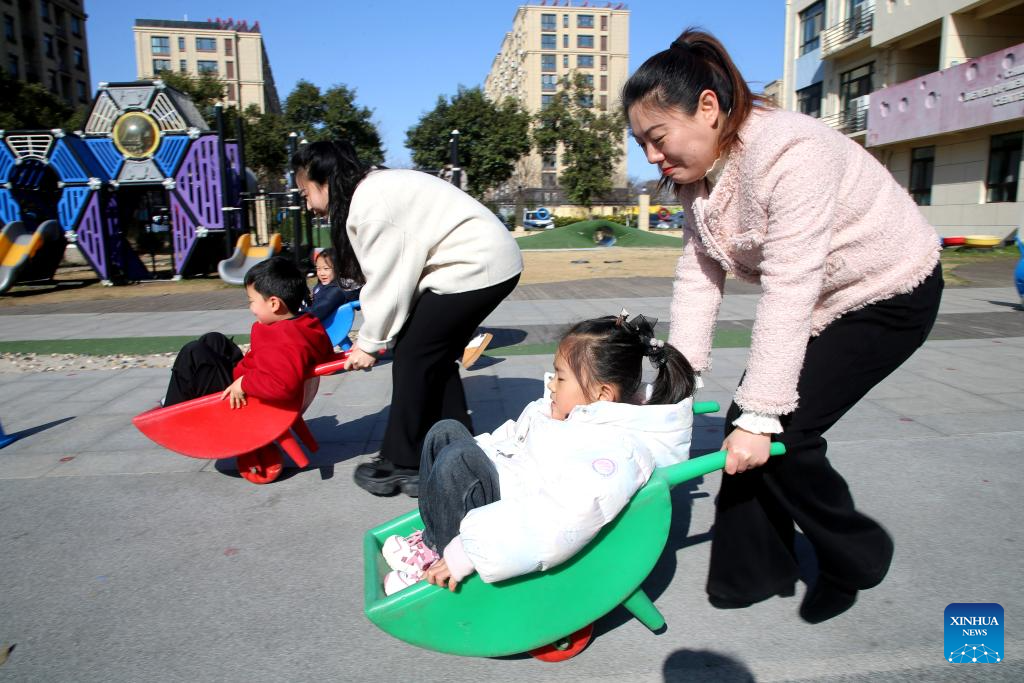 Children and their mothers attend a fun sports game at a kindergarten in Lianyungang City, east China's Jiangsu Province, March 8, 2026. Various events were held across China on Sunday to mark the International Women's Day. (Photo by Wang Chun/Xinhua)