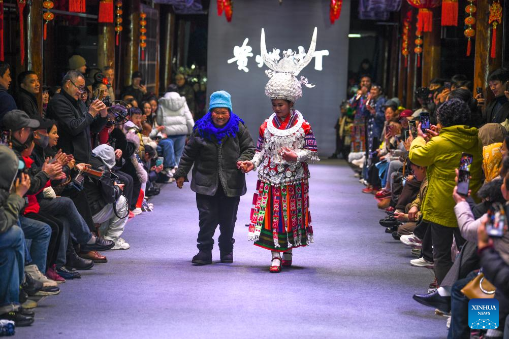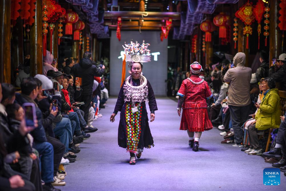 Models present traditional costumes during a "Village T" fashion show in Kaili, Qiandongnan Miao and Dong Autonomous Prefecture, southwest China's Guizhou Province, on March 8, 2026. Embroiderers from Qiandongnan Miao and Dong Autonomous Prefecture participated in the "Village T" fashion show to showcase colorful ethnic costumes. (Xinhua/Yang Wenbin)