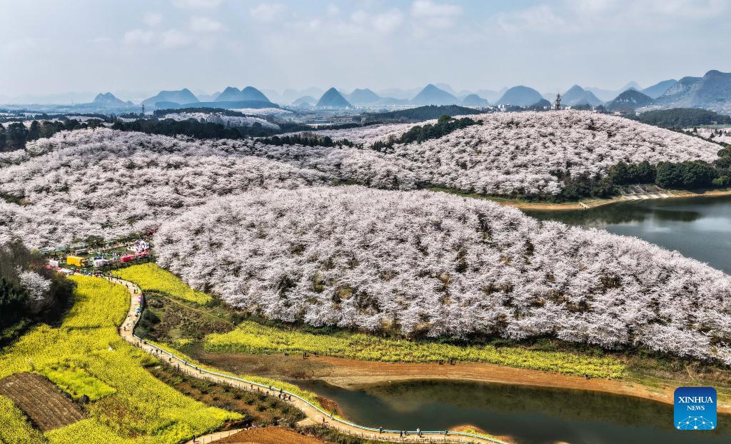 An aerial drone photo taken on March 11, 2026 shows cherry blossoms in Gui'an New Area, southwest China's Guizhou Province. (Xinhua/Tao Liang)