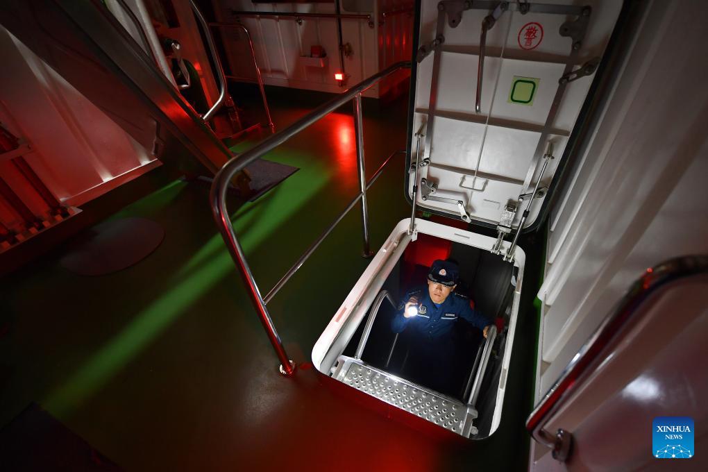 A law enforcer is pictured during a formation collaboration training aboard the China Coast Guard (CCG) vessel Sandu in the South China Sea, Feb. 28, 2026. The CCG vessel Sandu conducted patrols in the South China Sea to safeguard China's territorial sovereignty and maritime rights and interests. (Xinhua/Mao Jun)