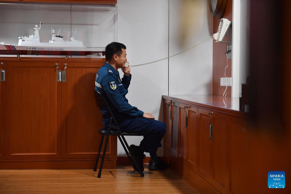A law enforcer speaks on the phone with his kin during his break time aboard the China Coast Guard (CCG) vessel Sandu in the South China Sea, March 8, 2026. The CCG vessel Sandu conducted patrols in the South China Sea to safeguard China's territorial sovereignty and maritime rights and interests. (Xinhua/Mao Jun)
