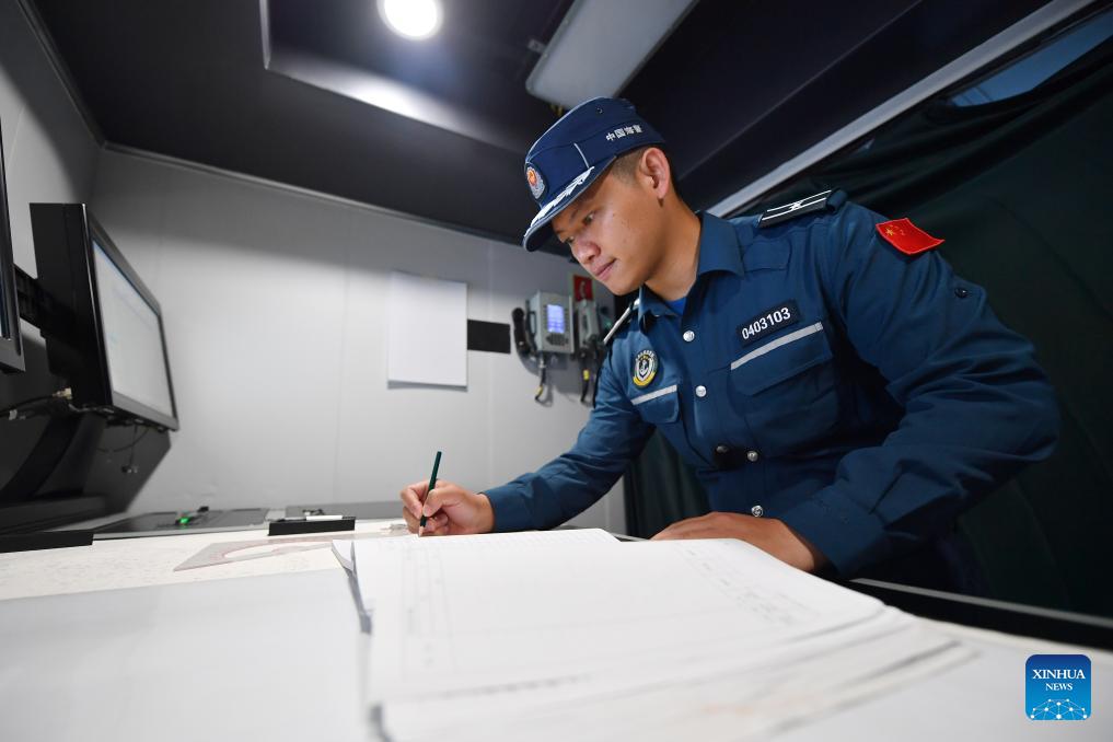 A law enforcer works on maps aboard the China Coast Guard (CCG) vessel Sandu in the South China Sea, March 6, 2026. The CCG vessel Sandu conducted patrols in the South China Sea to safeguard China's territorial sovereignty and maritime rights and interests. (Xinhua/Mao Jun)