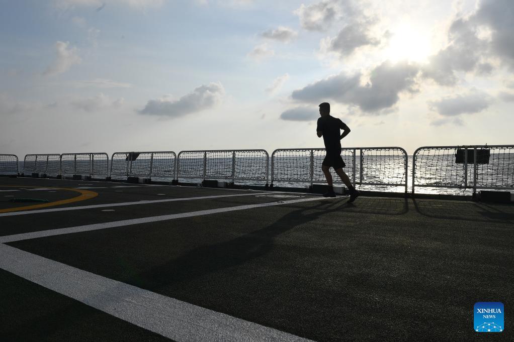 A law enforcer jogs aboard the China Coast Guard (CCG) vessel Sandu in the South China Sea, March 8, 2026. The CCG vessel Sandu conducted patrols in the South China Sea to safeguard China's territorial sovereignty and maritime rights and interests. (Xinhua/Mao Jun)
