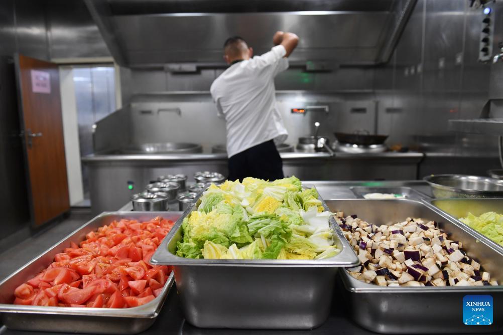 A law enforcer prepares dinner aboard the China Coast Guard (CCG) vessel Sandu in the South China Sea, March 8, 2026. The CCG vessel Sandu conducted patrols in the South China Sea to safeguard China's territorial sovereignty and maritime rights and interests. (Xinhua/Mao Jun)