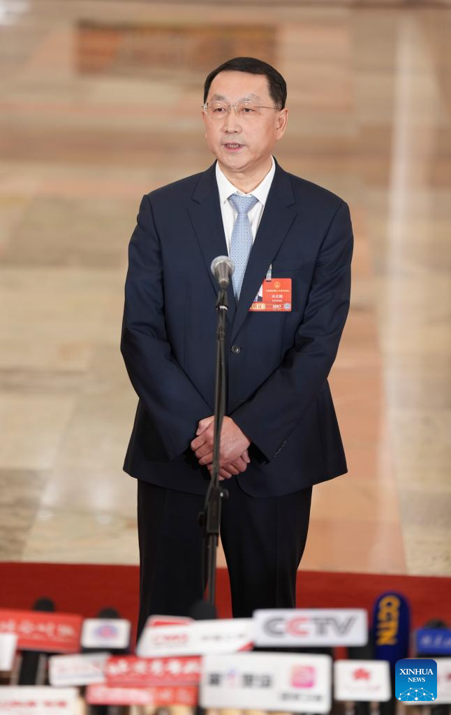 China's Minister of Natural Resources Guan Zhiou gives an interview after the closing meeting of the fourth session of the 14th National People's Congress (NPC) at the Great Hall of the People in Beijing, capital of China, March 12, 2026. (Xinhua/Wang Xi)