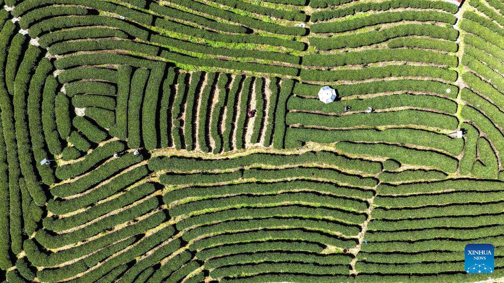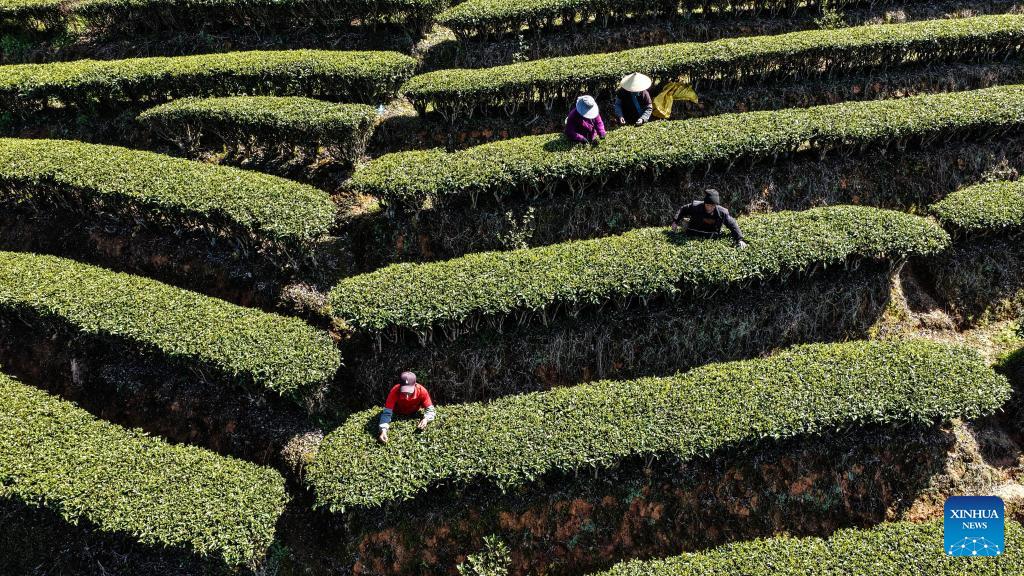 An aerial drone photo taken on March 12, 2026 shows farmers picking tea leaves in Sanjiang Dong Autonomous County, south China's Guangxi Zhuang Autonomous Region. As the spring tea picking season starts, tea factories and farmers are busy harvesting tea leaves in Sanjiang Dong Autonomous County. (Xinhua/Zhang Ailin)