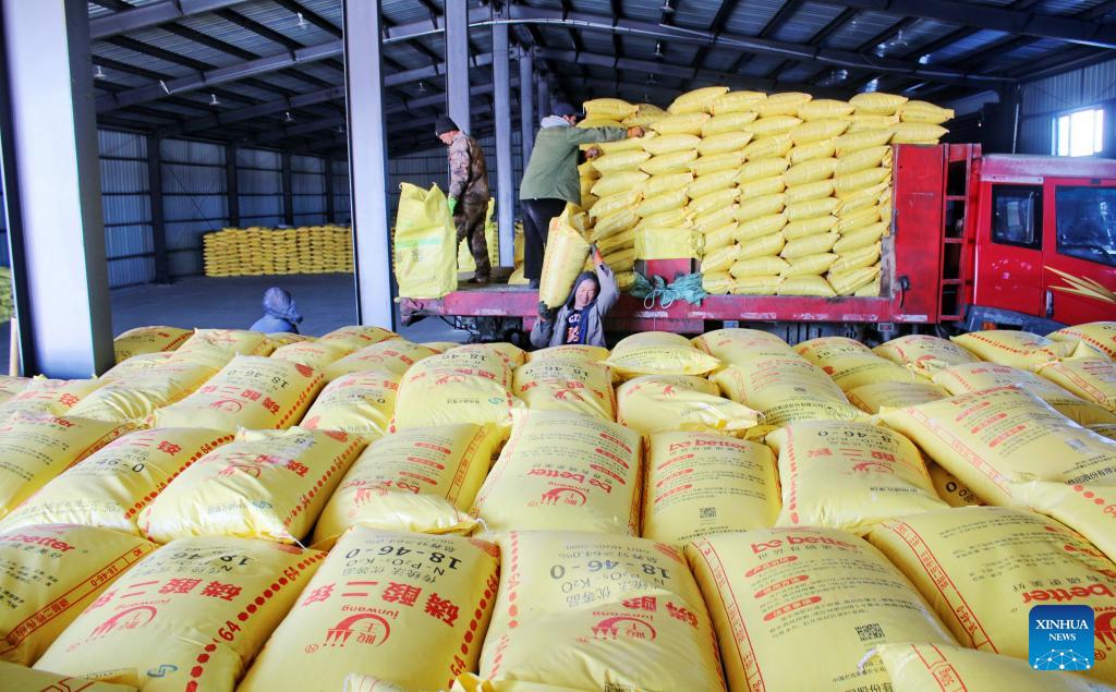 Workers carry fertilizers at a farming company under Beidahuang Group in northeast China's Heilongjiang Province, March 16, 2026. In recent days, the agricultural production units of Beidahuang Group in the Heilongjiang Reclamation Area are making preparation work for spring ploughing. (Photo by Lu Wenxiang/Xinhua)