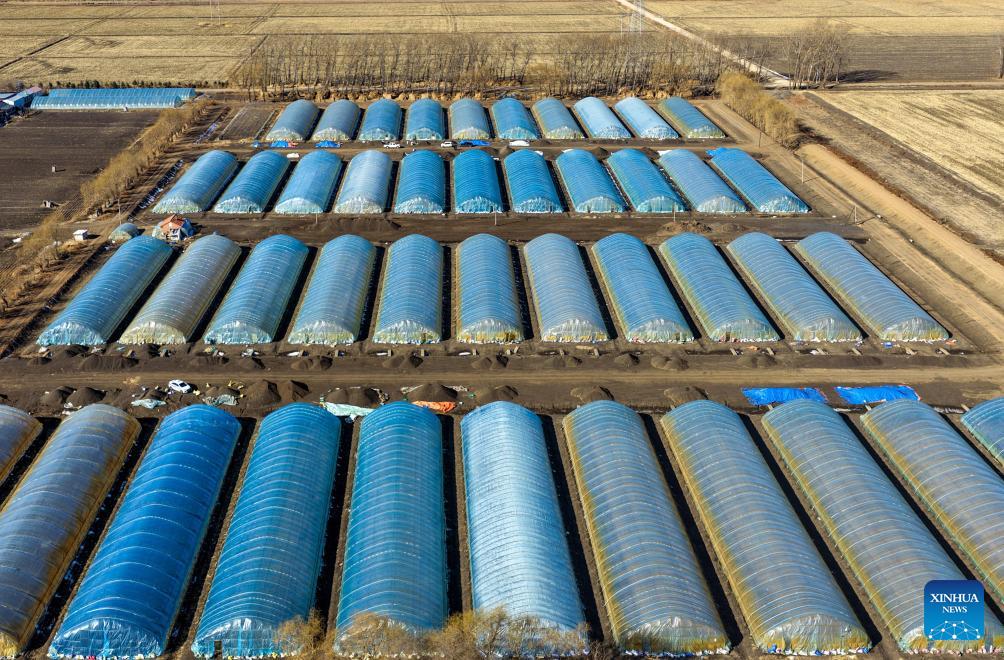 A drone photo taken on March 17, 2026 shows farmers preparing for seedling cultivation at Youyi Farm Co., Ltd. under Beidahuang Group in northeast China's Heilongjiang Province. In recent days, the agricultural production units of Beidahuang Group in the Heilongjiang Reclamation Area are making preparation work for spring ploughing. (Photo by Xu Hongyu/Xinhua)