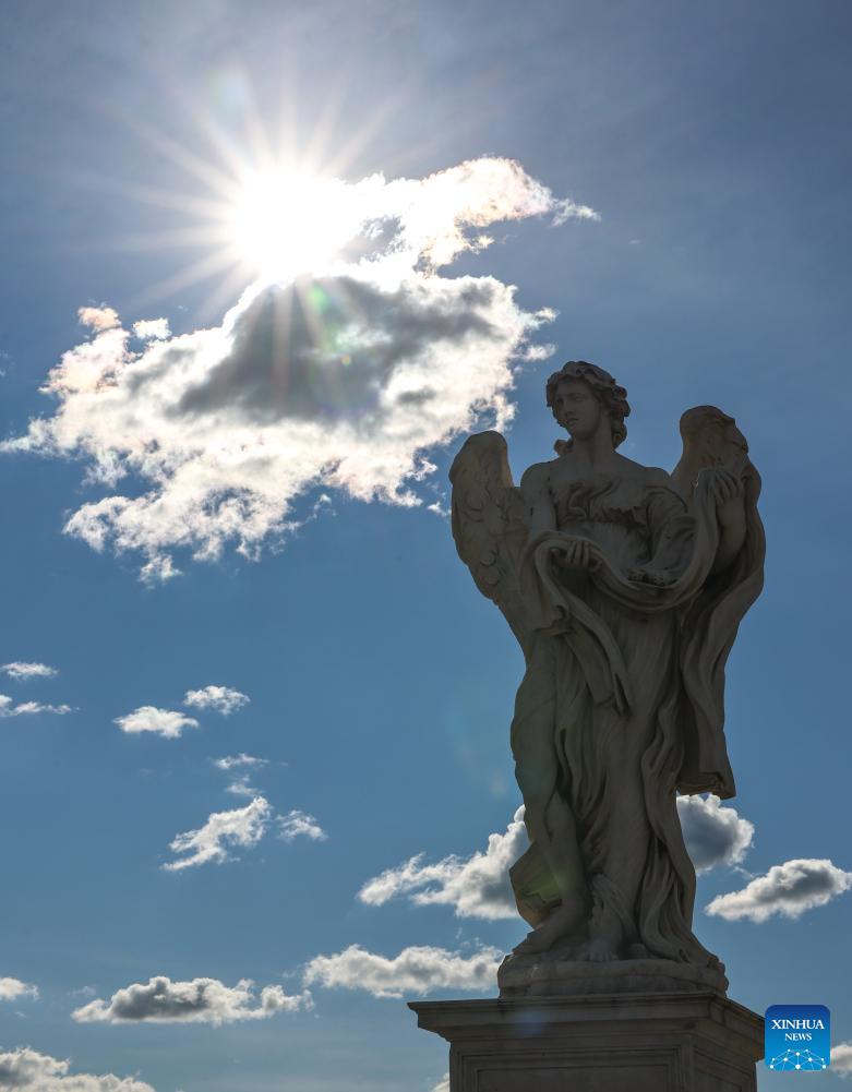 A statue is pictured on the Ponte Sant'Angelo in Rome, Italy, March 18, 2026. (Xinhua/Wang Kaiyan)