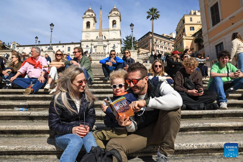 People enjoy leisure time at Spanish Steps in Rome, Italy, March 18, 2026. (Xinhua/Wang Kaiyan)