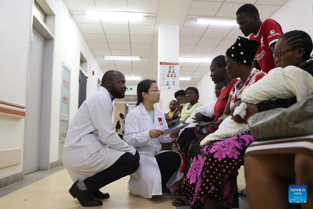 A Chinese doctor and a local medical worker interact with patients waiting for examination at the Levy Mwanawasa University Teaching Hospital in Lusaka, Zambia, on March 17, 2026. The 26th China Medical Team in Zambia arrived in the African country in June 2025. The team was divided into four groups, working respectively at the University Teaching Hospital, Levy Mwanawasa University Teaching Hospital, Ndola Teaching Hospital and Livingston Central Hospital. (Xinhua/Chen Wei)