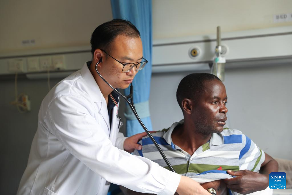 A Chinese doctor auscultates a patient at the Levy Mwanawasa University Teaching Hospital in Lusaka, Zambia, on March 17, 2026. The 26th China Medical Team in Zambia arrived in the African country in June 2025. The team was divided into four groups, working respectively at the University Teaching Hospital, Levy Mwanawasa University Teaching Hospital, Ndola Teaching Hospital and Livingston Central Hospital. (Xinhua/Chen Wei)
