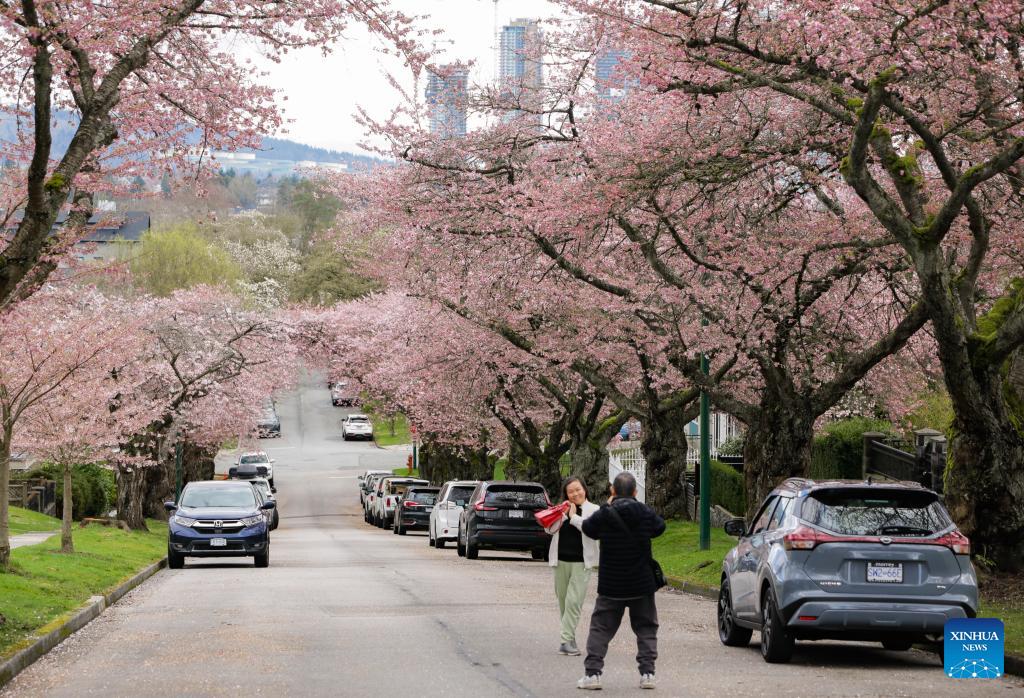 Tourists take photos with cherry blossoms on a street in Vancouver, British Columbia, Canada, on March 20, 2026. (Photo by Liang Sen/Xinhua)