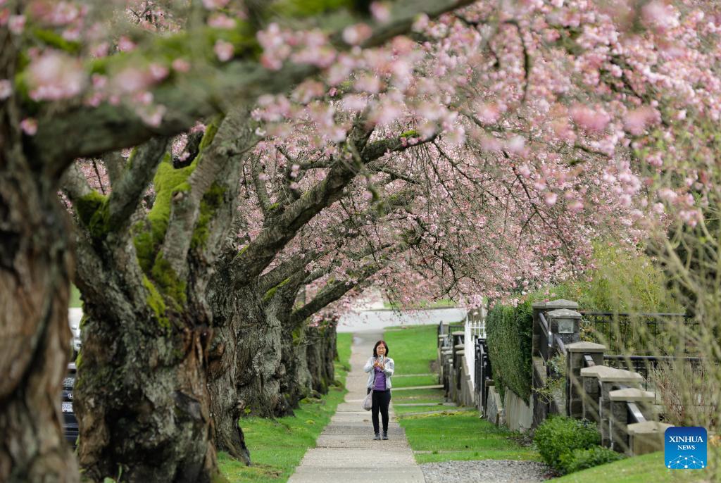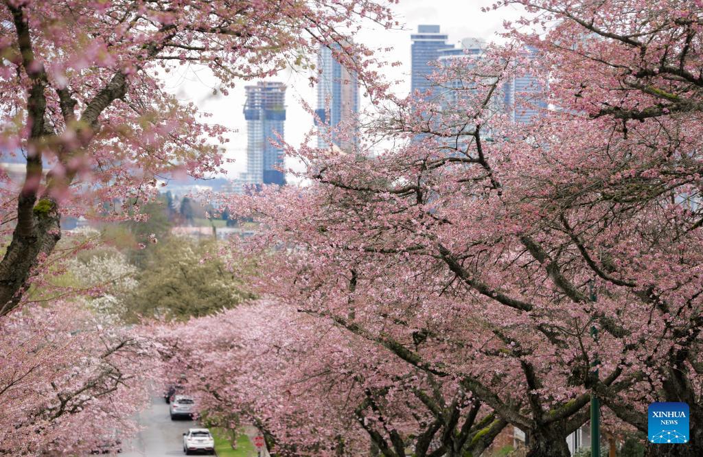This photo taken on March 20, 2026 shows cherry blossoms along a street in Vancouver, British Columbia, Canada, on March 20, 2026. (Photo by Liang Sen/Xinhua)