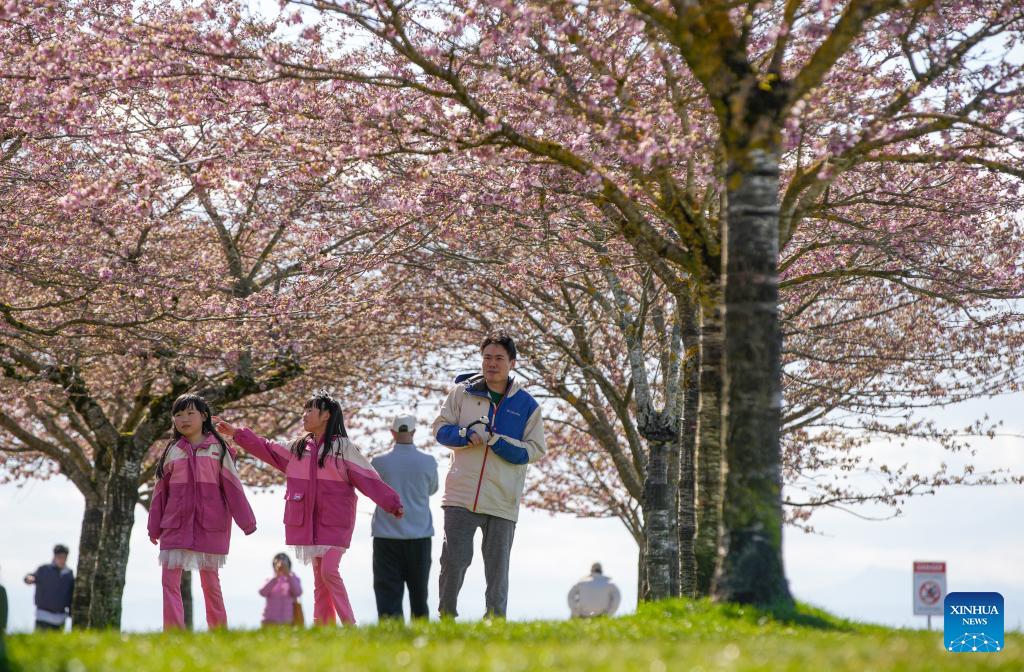 Tourists view cherry blossoms at a park in Vancouver, British Columbia, Canada, on March 20, 2026. (Photo by Liang Sen/Xinhua)