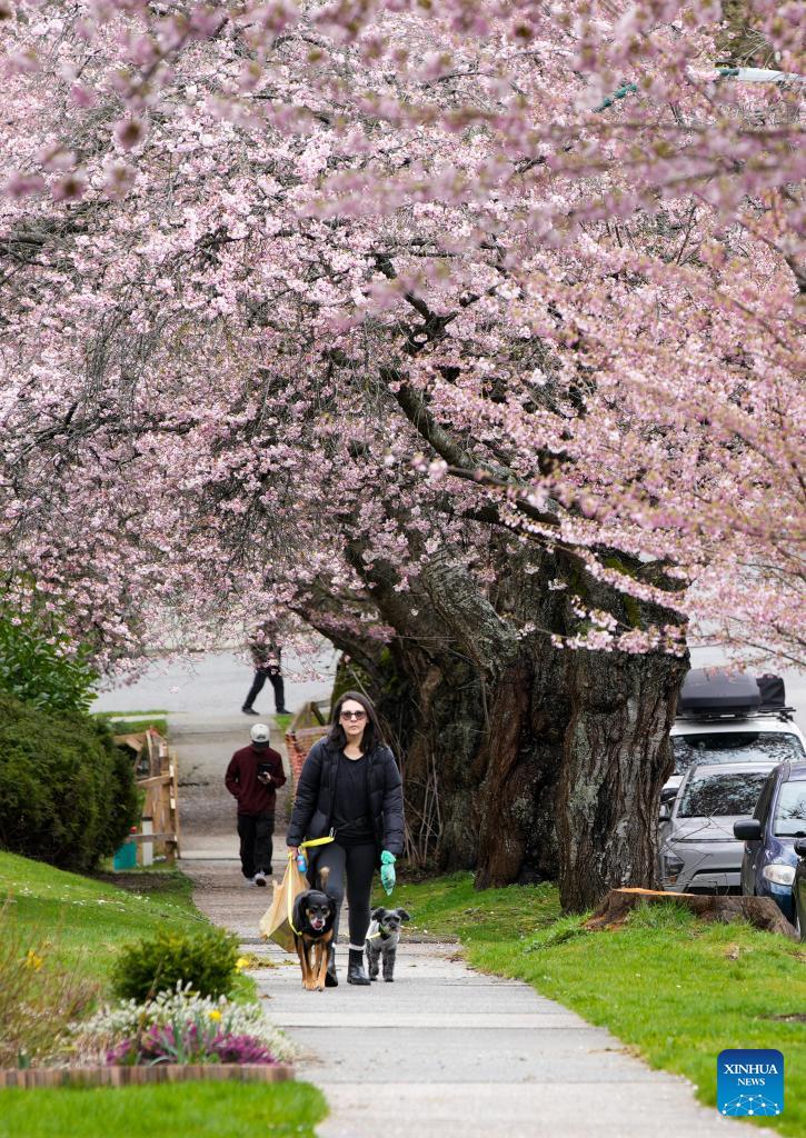 A woman walks dogs on a street lined with cherry blossom trees in Vancouver, British Columbia, Canada, on March 20, 2026. (Photo by Liang Sen/Xinhua)