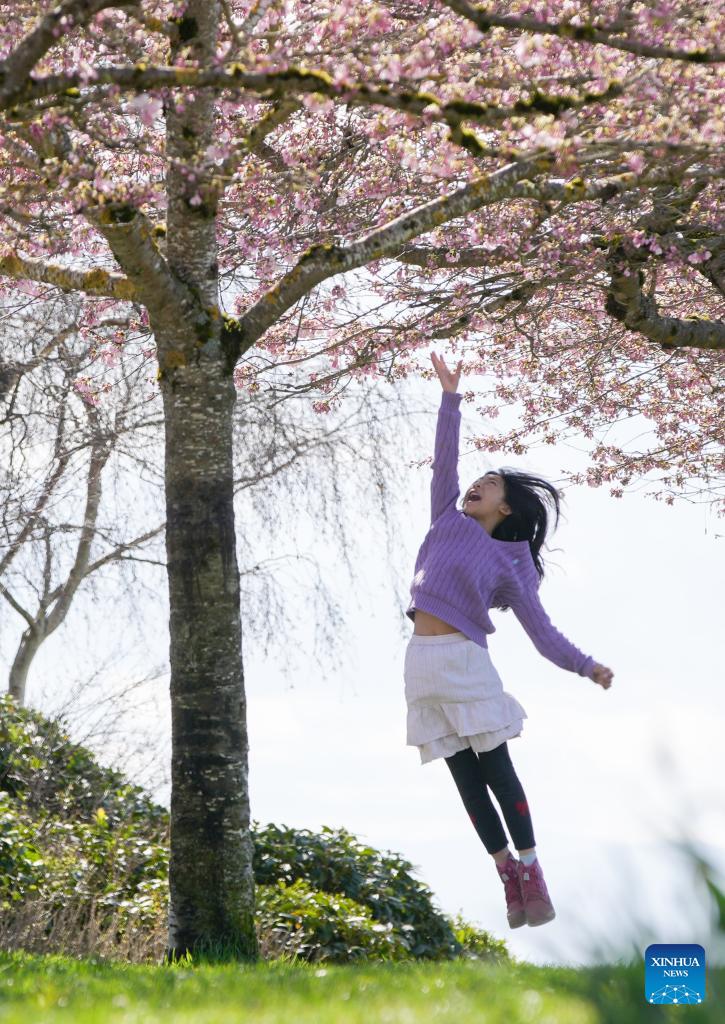 A girl jumps up to touch cherry blossoms at a park in Vancouver, British Columbia, Canada, on March 20, 2026. (Photo by Liang Sen/Xinhua)
