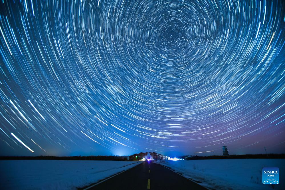 This stack composite photo taken on March 23, 2026 shows the aurora observed from Jiayin County, northeast China's Heilongjiang Province. Due to the influence of geomagnetic activities, many places in Heilongjiang Province witnessed splendid auroras from the night of March 22 to the early morning of March 23. (Photo by Li Shaojun/Xinhua)
