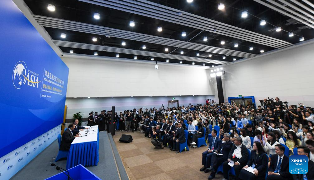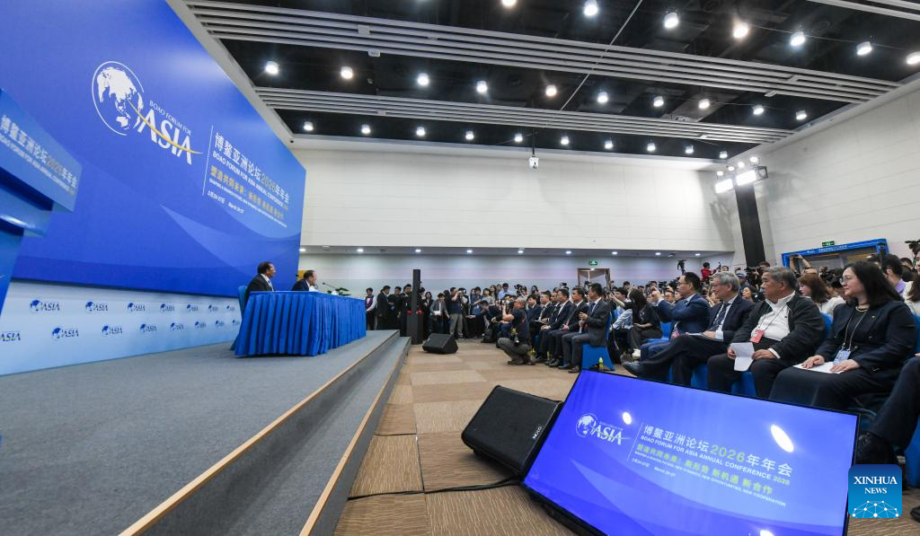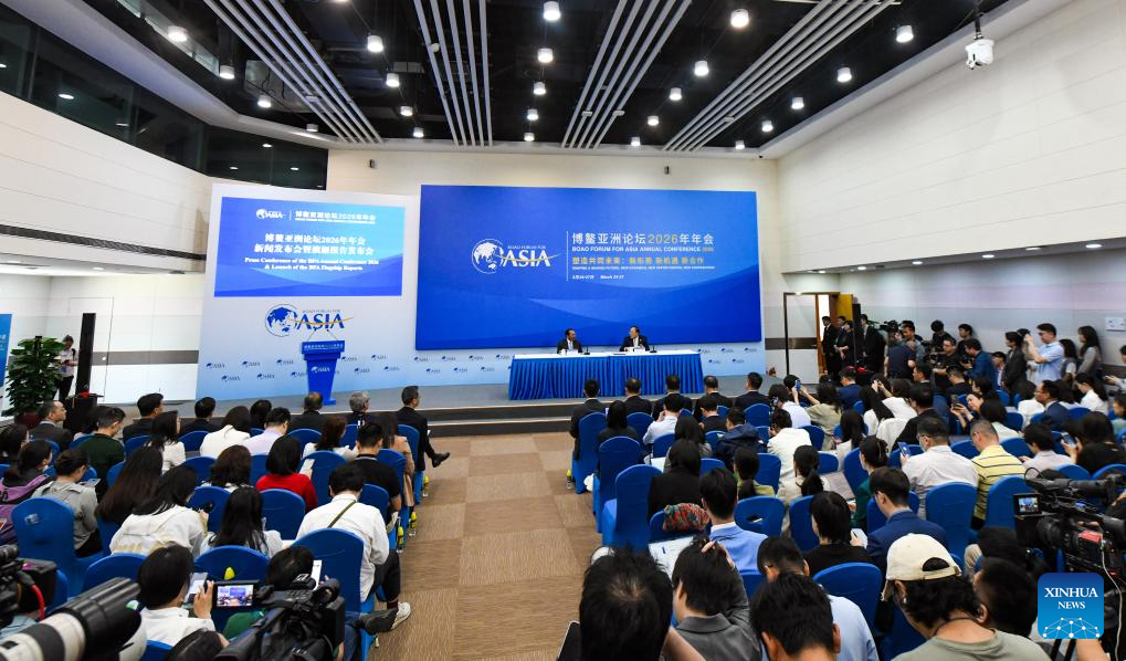 This photo taken on March 24, 2026 shows the scene of the press conference for the Boao Forum for Asia (BFA) annual conference 2026 and launch of the BFA flagship reports in Boao, south China's Hainan Province. Asia remains the world's primary growth engine, with its economy forecast to expand by 4.5 percent in 2026, according to a report released by the Boao Forum for Asia (BFA) on Tuesday. Running from March 24 to 27, this year's conference is themed "Shaping a Shared Future: New Dynamics, New Opportunities, New Cooperation." (Xinhua/Yang Guanyu)