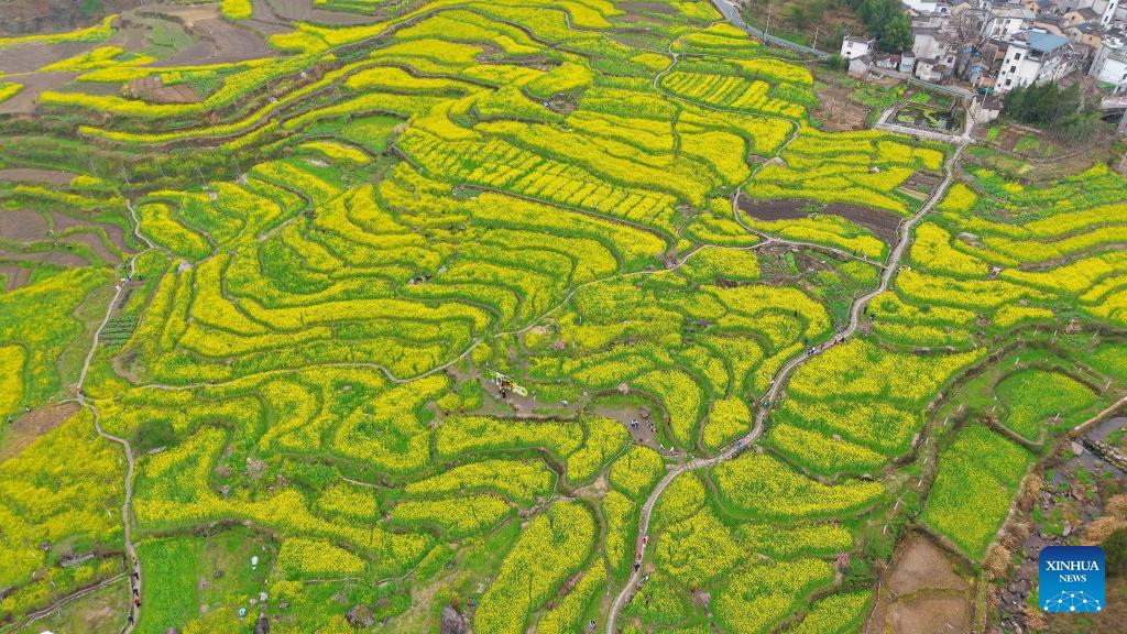 This photo taken on March 22, 2026 shows rapeseed flowers in Xingfu Village, Jixi County, Xuancheng City, east China's Anhui Province. (Xinhua/Zhang Duan)