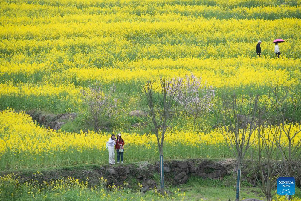 Tourists enjoy rapeseed flowers in Xingfu Village, Jixi County, Xuancheng City, east China's Anhui Province, March 22, 2026. (Xinhua/Zhang Duan)