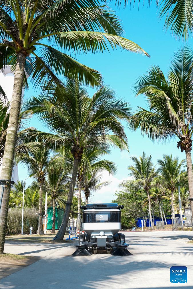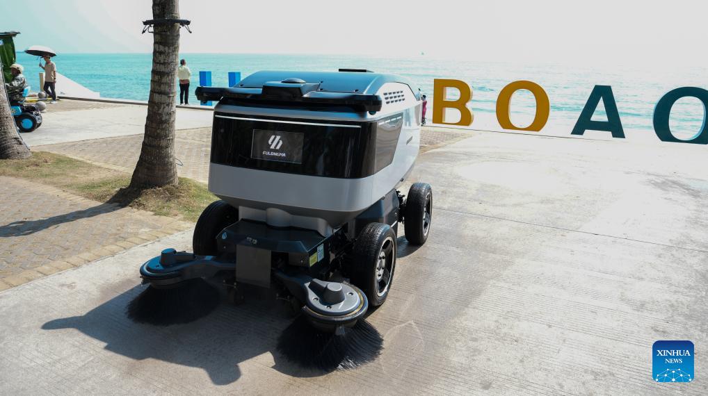 An intelligent cleaning robot works in Boao Town, Qionghai City, south China's Hainan Province, March 23, 2026. Smart sanitation facilities are in service during the Boao Forum for Asia (BFA) Annual Conference 2026, becoming a highlight of urban services with accurate dispatch, rapid disposal and high standards. (Xinhua/Yang Guanyu)