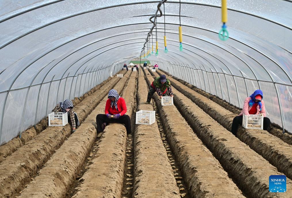 Farmers plant ginger in a greenhouse of Daxinzhuang Town of Fengnan district, Tangshan, north China's Hebei Province, on March 26, 2026. Spring farming is in full swing in Fengnan as the weather warms up. (Xinhua/Yang Shiyao)